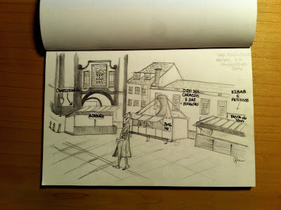 No Páteo d'Alfândega, Angra do Heroísmo, em véspera das Sanjoaninas 2016. O desafio de hoje foi desenhar um pouco dos espaços das festas que começam já amanhã. Aqui temos Vasco da Gama que se anuncia para celebrar "Uma capital no Coração do Atlântico". O que não vemos é o reboliço e a azáfama para ter as tasquinhas prontas a tempo e horas.
