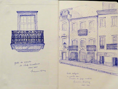 O meu primeiro desenho foi difícil, iniciei-o com pessoas e já não sei porque motivo não as continuei, sobrepus-lhes o registo de dois vãos do Millenium no Largo da Matriz. Senti-me desconcentrada, «enferrujada» e com dificuldade em estruturar os elementos. Por desafio, pessoal, evito o uso da borracha e tento fazer uma «escrita à primeira» do que seleciono com o olhar... desta vez a confrontação com a rigidez da geometria exigiu-me uma atitude mais técnica e menos teimosa da minha parte. Custou-me imenso fazer esta página, mas por outro lado, ainda bem que não desisti.