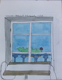 | Não consigo deixar de manifestar o meu agrado pela fotografia que o Francisco Queiroz nos tirou, cuja coloração se faz - numa relação de complementaridade - entre tons de azul e amarelo alaranjado, propondo uma ambiência em harmonia e em sintonia com o nosso simpático encontro. (Caneta caligráfica EF, grafite, aguarela) |«in situ» | |