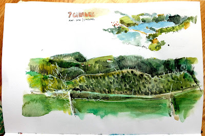 Fui já no fim do dia e o tempo era pouco, assim resolvi usar a tinta da China rapidamente e dar apenas uma aguarelada na água.