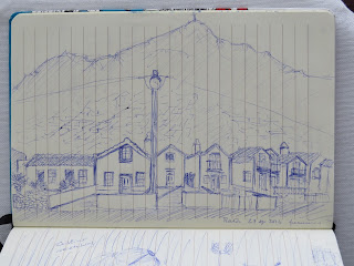 Ao chegarmos, fomos levados para as instalações d'Os Marienses e instalamo-nos. Sentia-me cansada, mas como é habitual, estranhei a ambiência, e após muitas voltas na cama, lá adormeci. Acordei às 7, e fui para baixo tomar o pequeno almoço. Havia poucas pessoas na rua, à exceção de um ou outro senhor que iam ao café mais por hábito do que necessidade. Aproveitei a tranquilidade da manhã para desenhar o que via, e reaproveitar o desenho que fiz do Manuel na noite anterior.