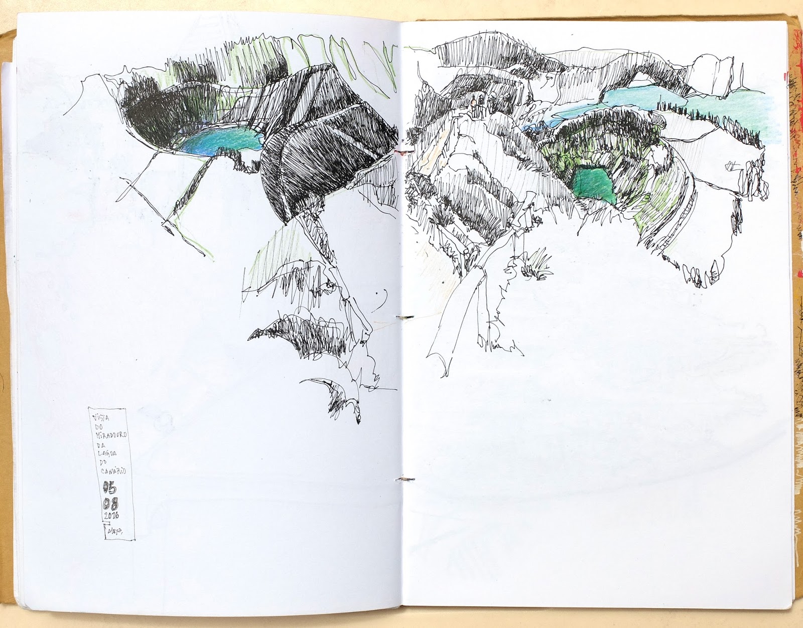 | Existem locais dificilmente explicados por palavras... o Miradouro da Lagoa do Canário permite aceder a um de vários paraisos deste onde vivo... usei cor apenas nas lagoas (à esquerda a Rasa, a de Santiago a verde e no último plano as Sete Cidades)... (Graph'it fine Liner e lápis de cor) |«in situ»| |