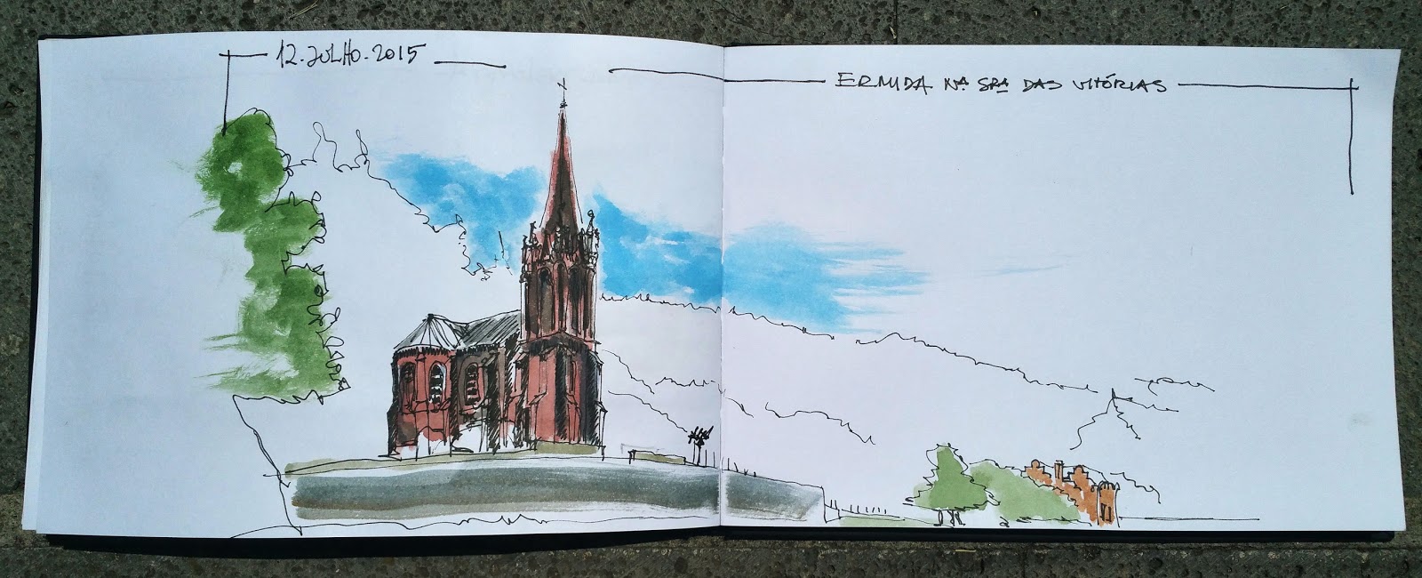 tenho dado conta da ausência de cor nos meus rabiscos. dou mais conta disso quando são outros a dizê-lo. mas a verdade é essa; não estou a conseguir. ou por algum receio, ou por algum estado de espírito. por outro lado, também sinto que pouco ou nada tenho entrado em pormenores. acho que o diário gráfico em formato panorâmico está a fazer com que dê uma visão mais ampla aos espaços que rabisco. e talvez, por isso, não esteja a pormenorizar tanto quanto já fiz em outros rabiscos.