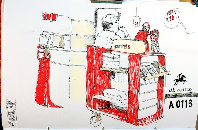 | Passo com frequência nos ctt e hoje lembrei-me que tinha um desenho de espera «interminável». Há uma espécie de «entupimento» nestes serviços desde que passou a tratar das questões de reembolso de viagens aéreas e afins. Ainda com a porta fechada forma-se uma fila à porta que depois das 9:00 se transfere para o interior e ocorre ao longo do dia em contínuo... (Graph'it shake, Graph'it fine Liner) |«in situ»| |